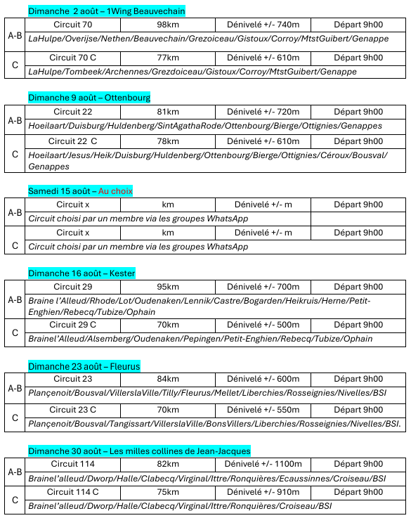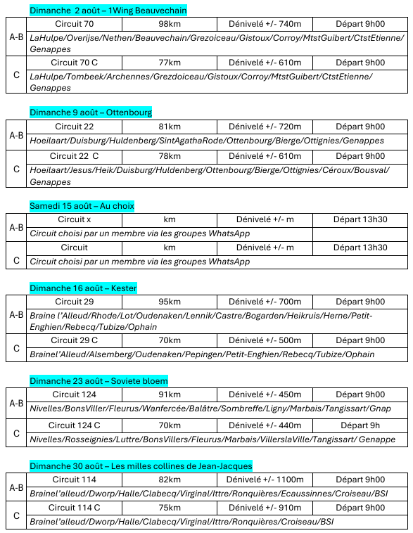 Groupe D : Pas de programme prévu - Tous les dimanches et jours fériés, circuit spécifique de 50 km - Départ 10h00 gare de Lillois