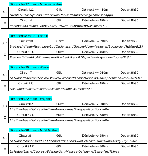 Groupe D : Pas de programme prévu - Tous les dimanches et jours fériés, circuit spécifique de 50 km - Départ 10h00 gare de Lillois