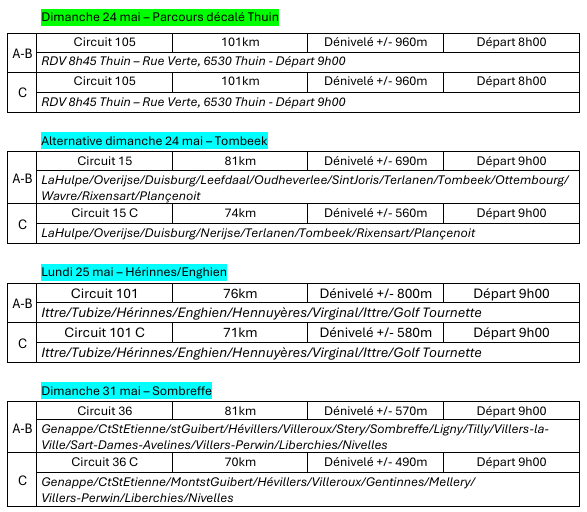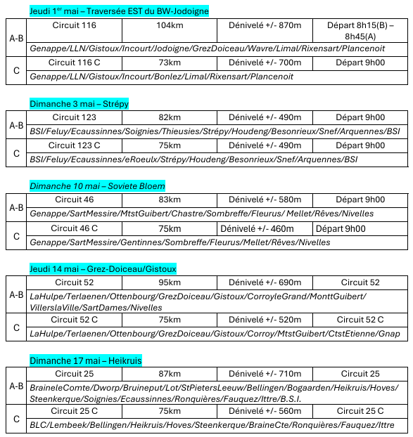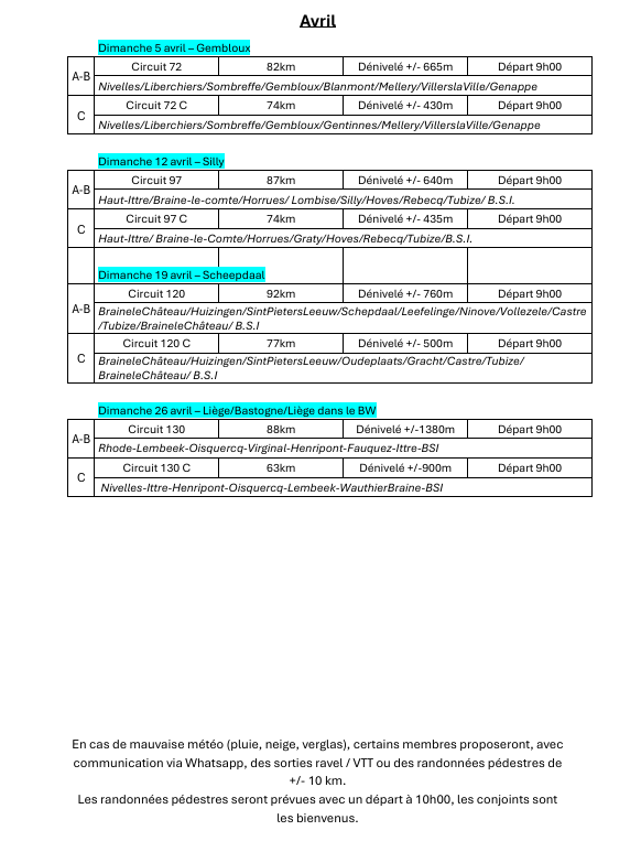 Groupe D : Pas de programme prévu - Tous les dimanches et jours fériés, circuit spécifique de 50 km - Départ 10h00 gare de Lillois