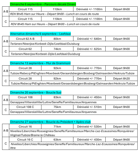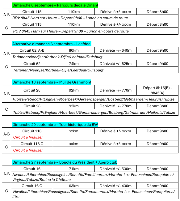Groupe D : Pas de programme prévu - Tous les dimanches et jours fériés, circuit spécifique de 50 km - Départ 10h00 gare de Lillois